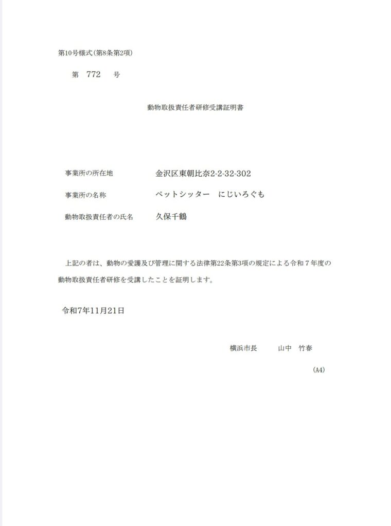 令和7年度、動物取扱責任者研修を修了しましたので、ご報告します。