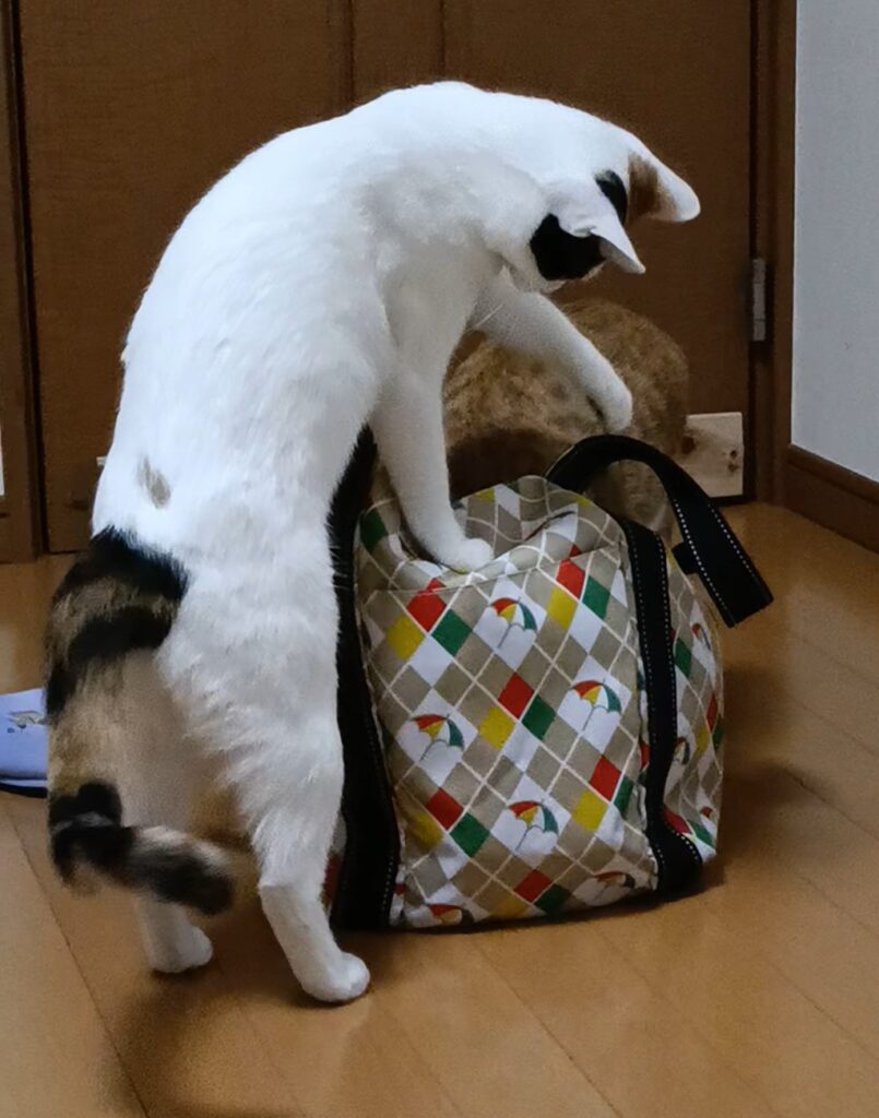 夏のときから変わらず、ふたりは私のカバンが大好き。
