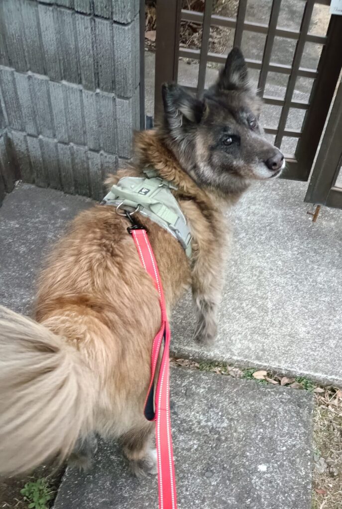 格闘の末、ようやくリードを繋いで玄関の外へ。