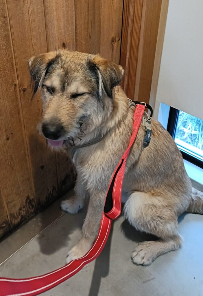 この子は、遠方の保護施設からご家族に迎えられたワンちゃんで、まだ1歳にも満たない若さながら、体はしっかり大きく、外見はまるでブリティッシュウルフハウンドのよう。