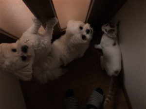 段々とお留守番に慣れて、仲良くなった最後のお世話では扉の前で3人が通せんぼ(笑)