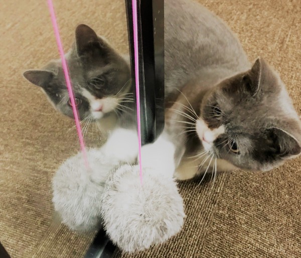 また下に戻って鏡の前でおもちゃにじゃれて2倍かわいいマンちゃん