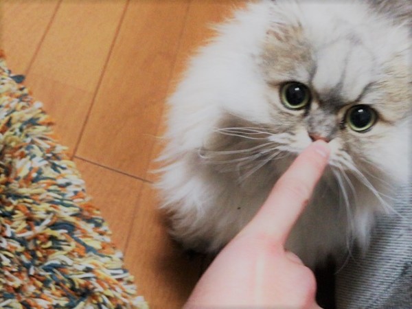 でもそれでもやはりカニカマを見つめ、手を膝の上にのせる