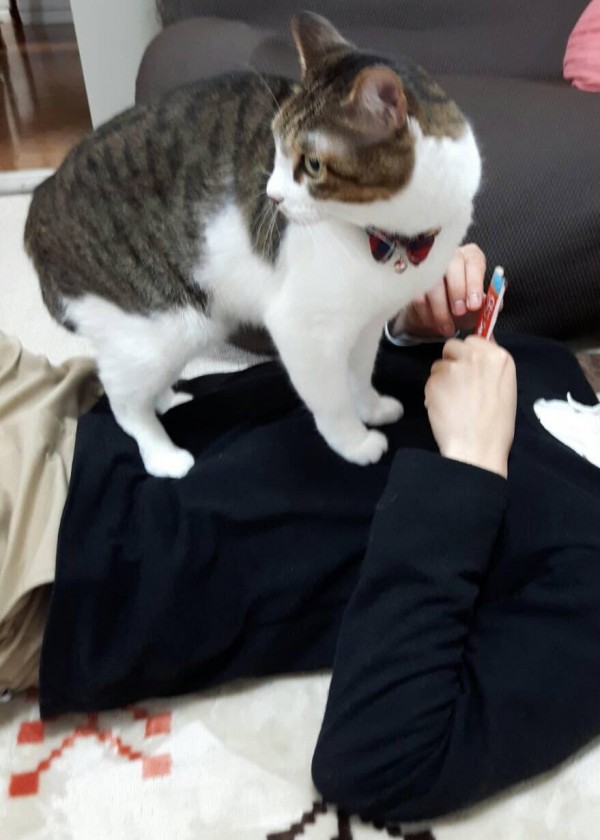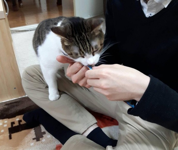 飼い主様に許可をもらいエサ(ちゅーる)を使い、視線を合わせず近づき
