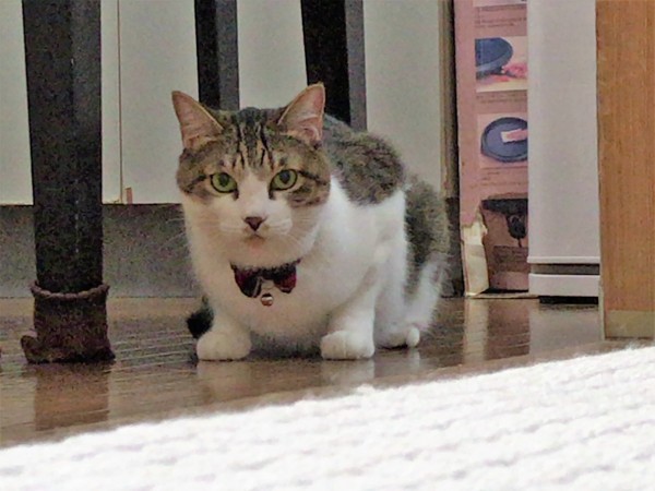 姿は見えるけどもテーブルの下に隠れこっちを見て完全に警戒してますね(笑)