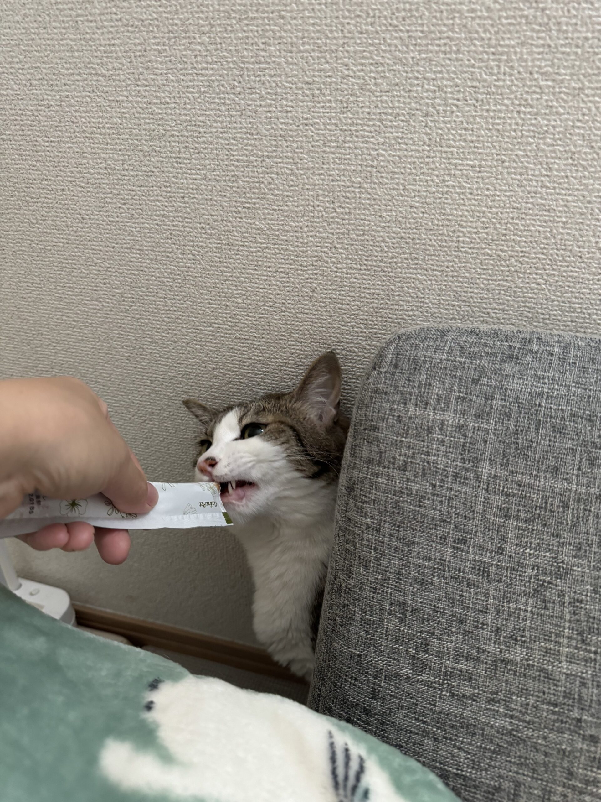 次の日もまたソファの裏にいましたが、チュールで誘ってみるとなんと食べてくれました👏