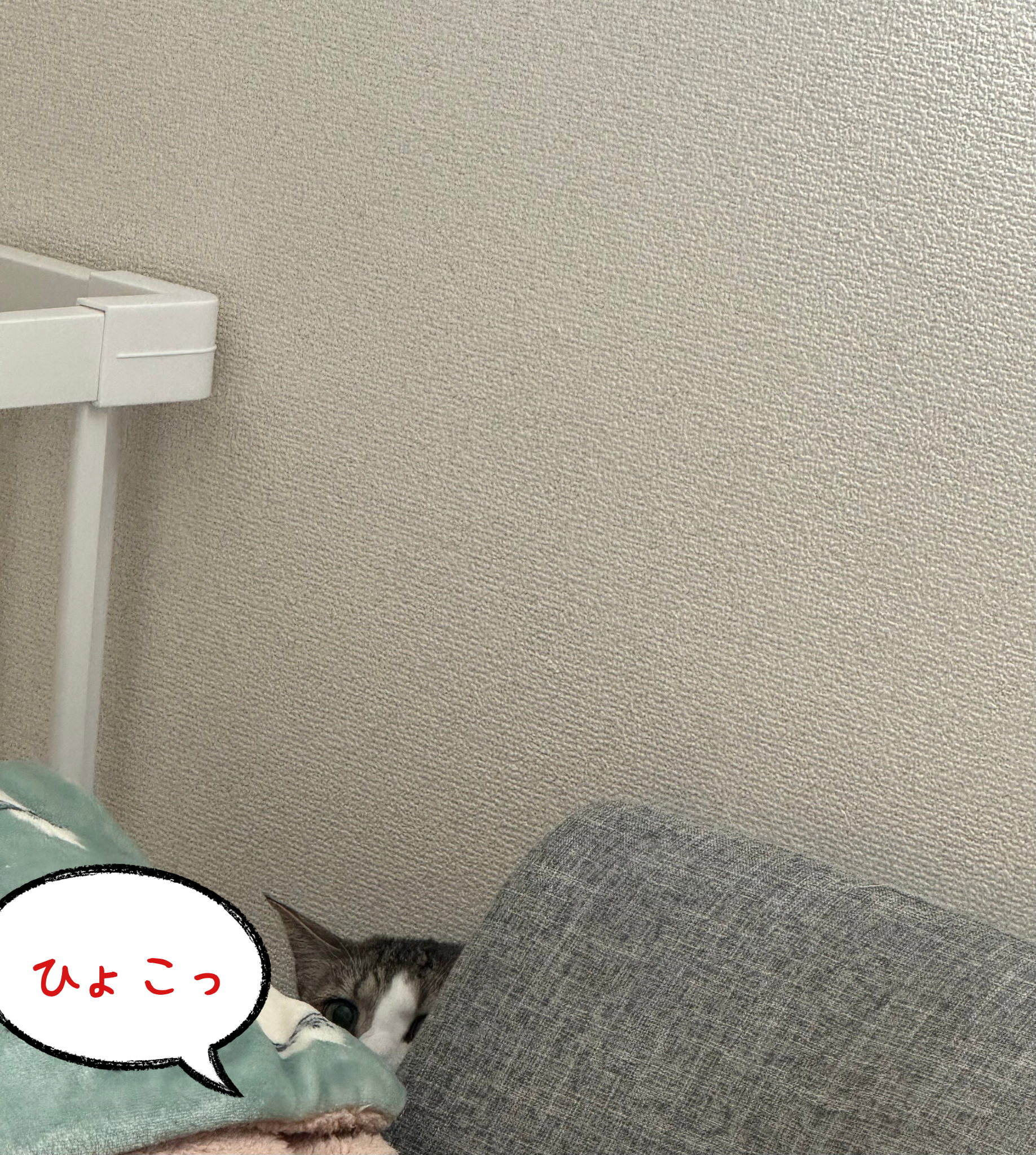 お世話初日は話しかけても姿を見せず、片付けなどしているとヒョコッとソファの裏から顔を出してくれました☺️か、かわいい〜