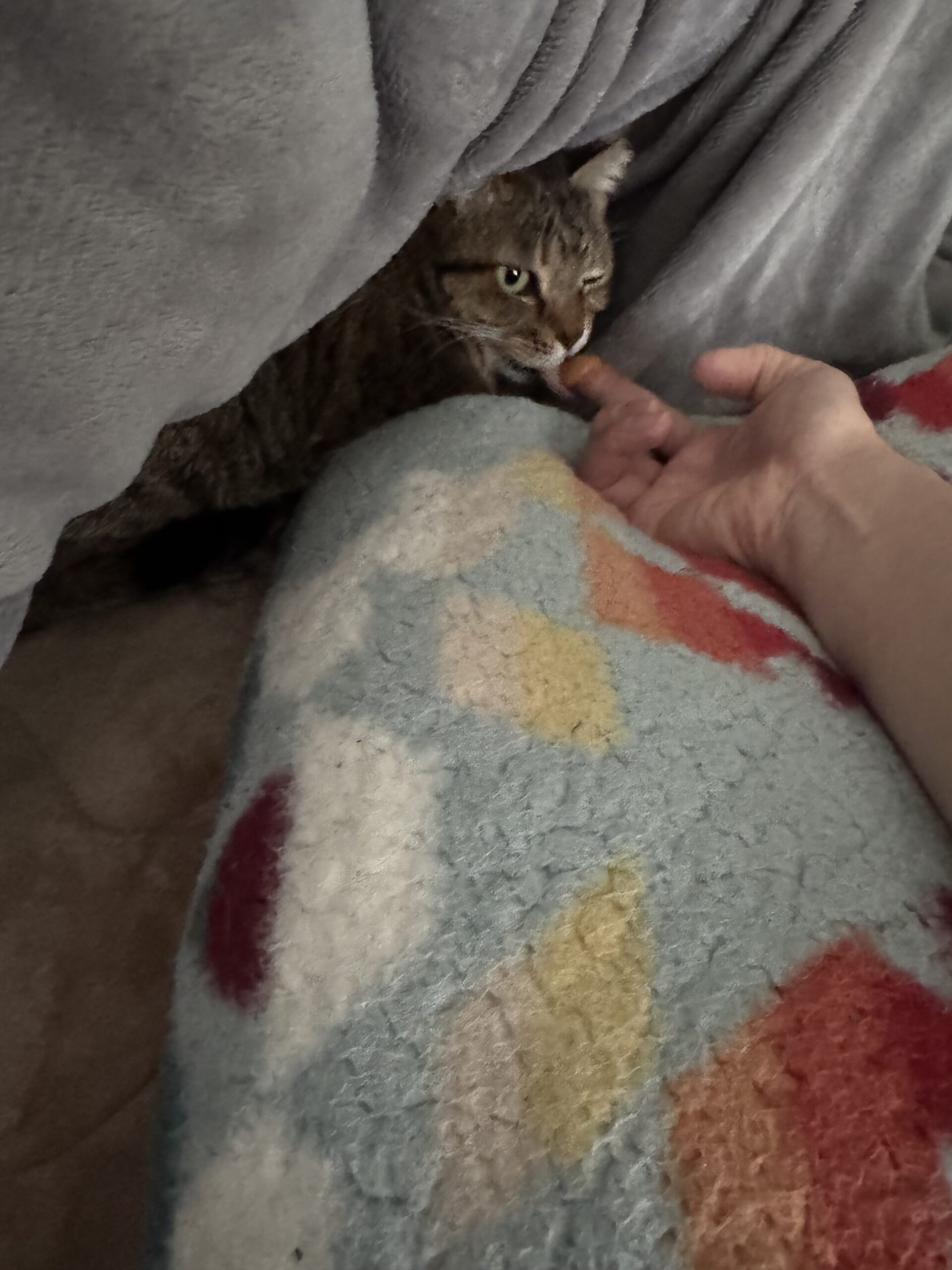 いつもは完食するご飯も食べておらず心配でしたが、布団の隙間からチュールは食べてくれ一安心。