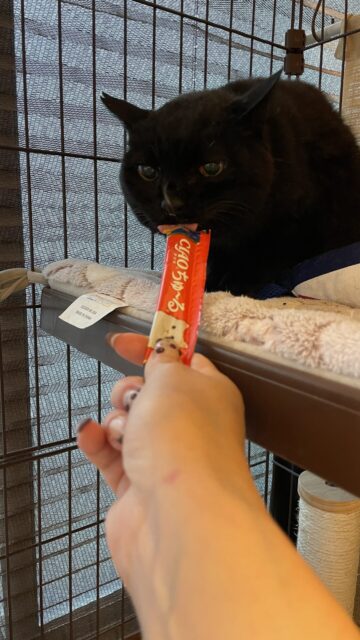 近づくとシャー💢をしますが、チュールは手から食べてくれます💕