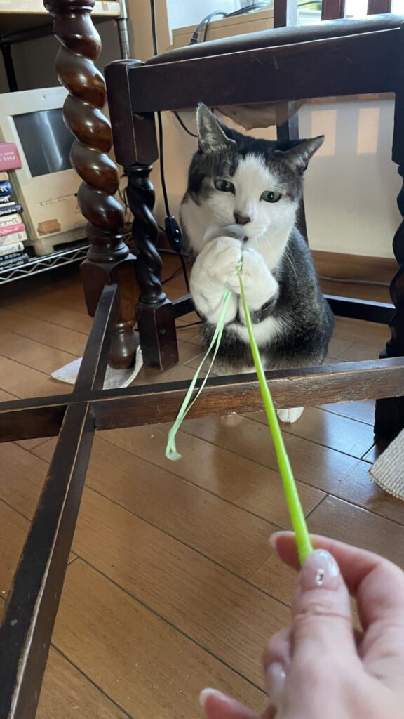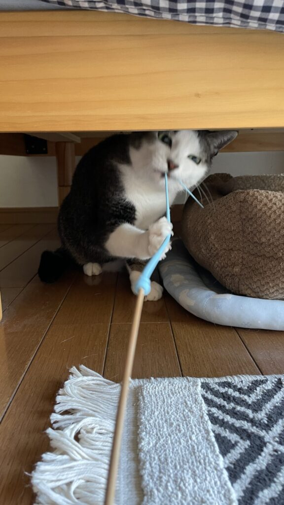 ジャラシを出すと、爪研ぎをして気合いを入れて、椅子やベッドの下に隠れながら、狙ってきます😆