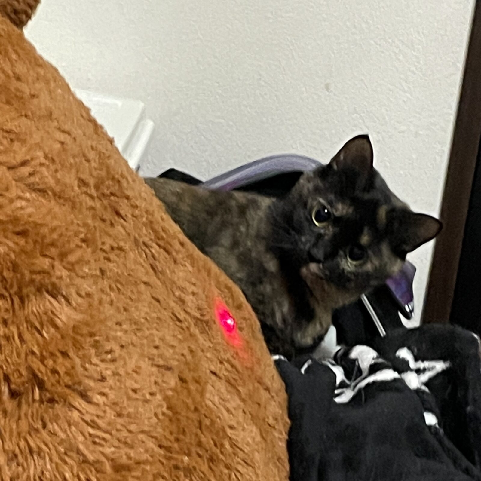 エマちゃんは怖がって、シマちゃんの後ろの布団に隠れています😅