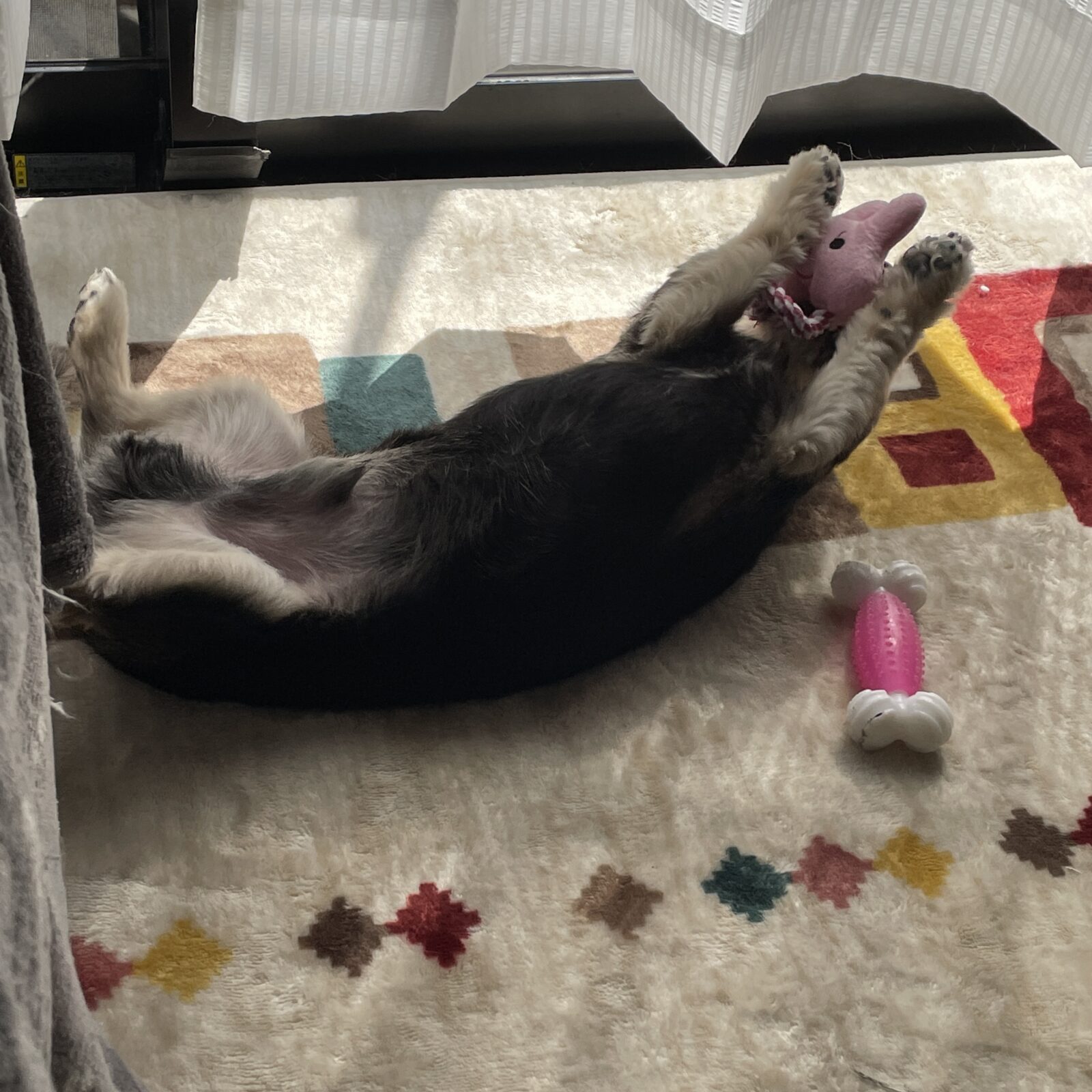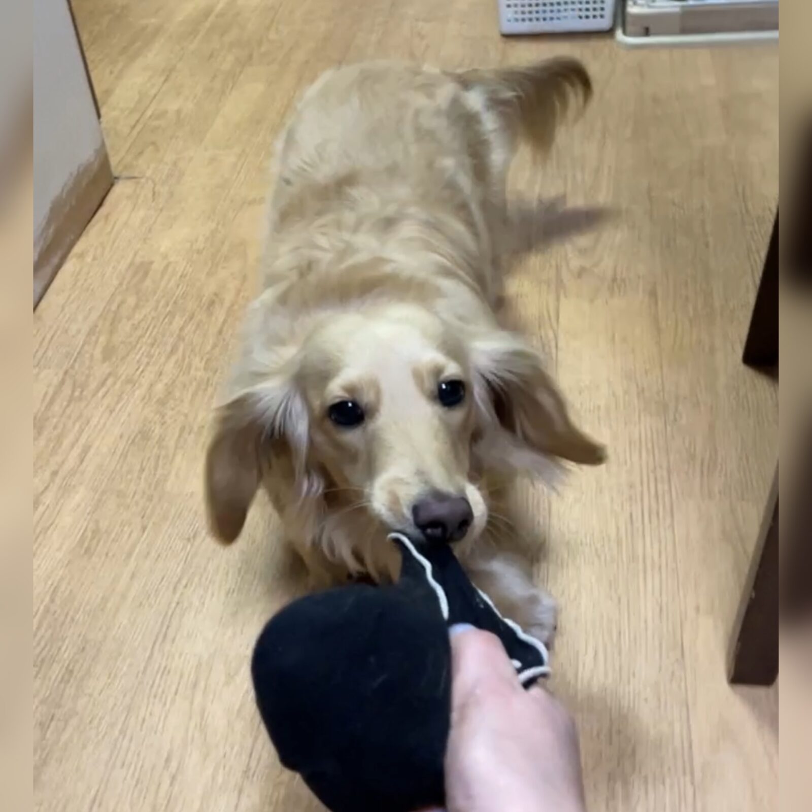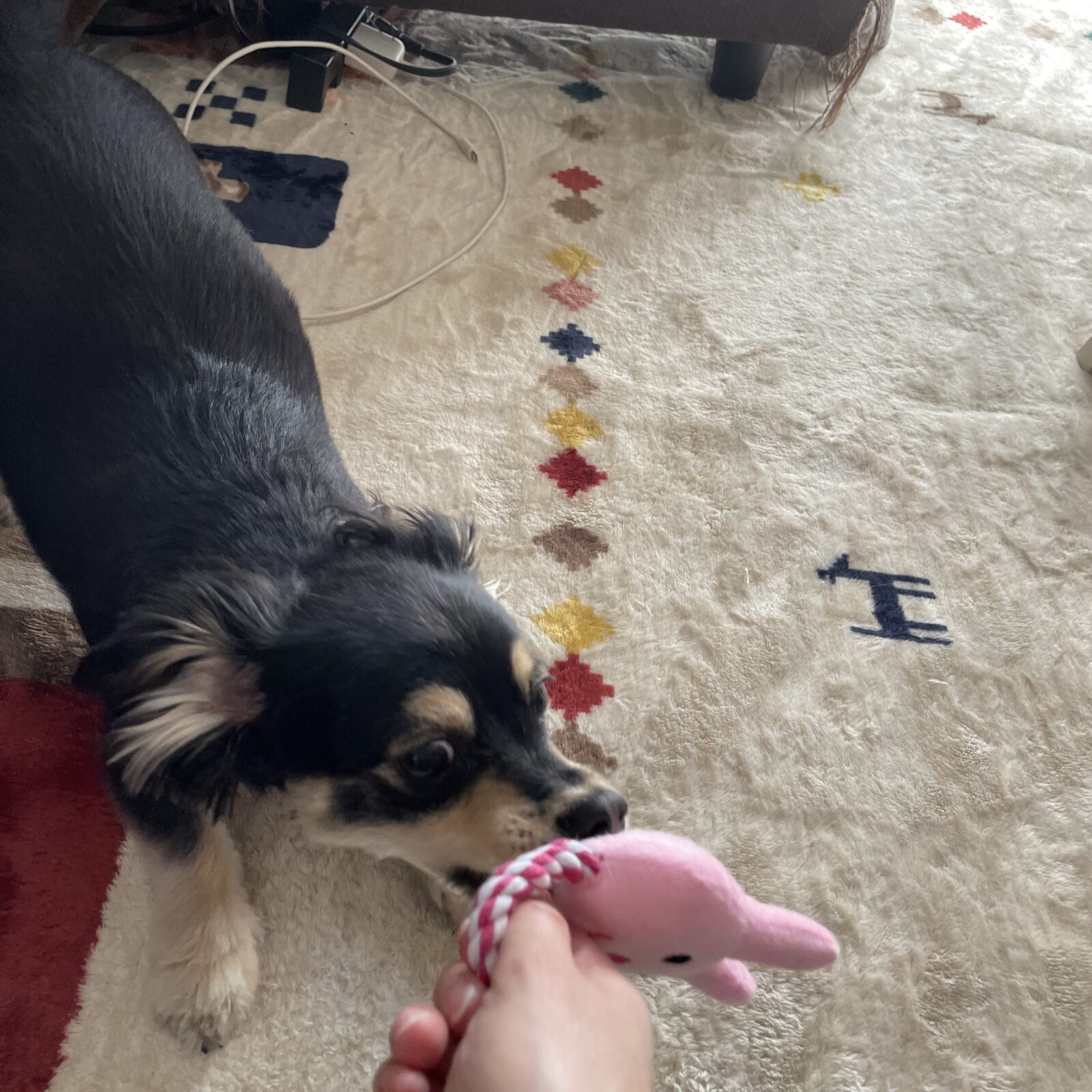 ダンボ君は、🐰のぴーぷーで遊びました。投げては獲ってくるをエンドレス😅💦