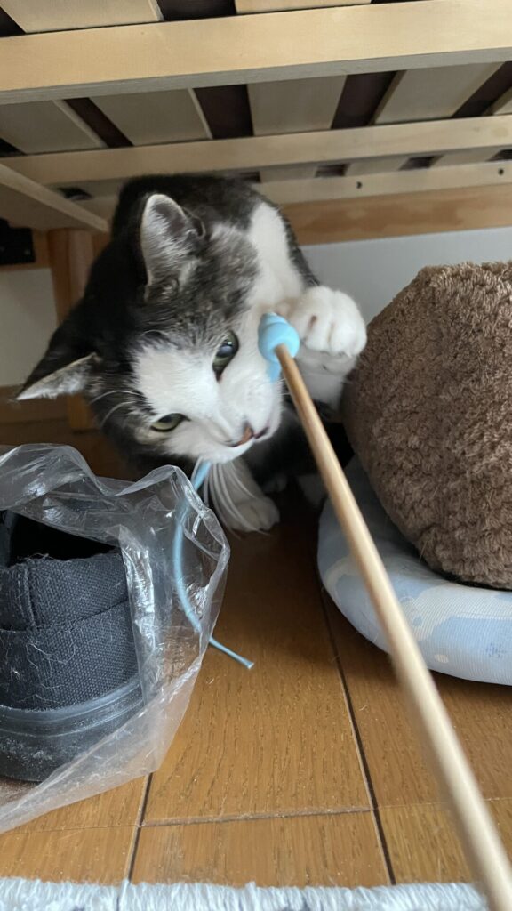 ジャラシで遊ぶと、部屋中を駆け回り💨ベッドの下にかくれながら狙いをさだめて、