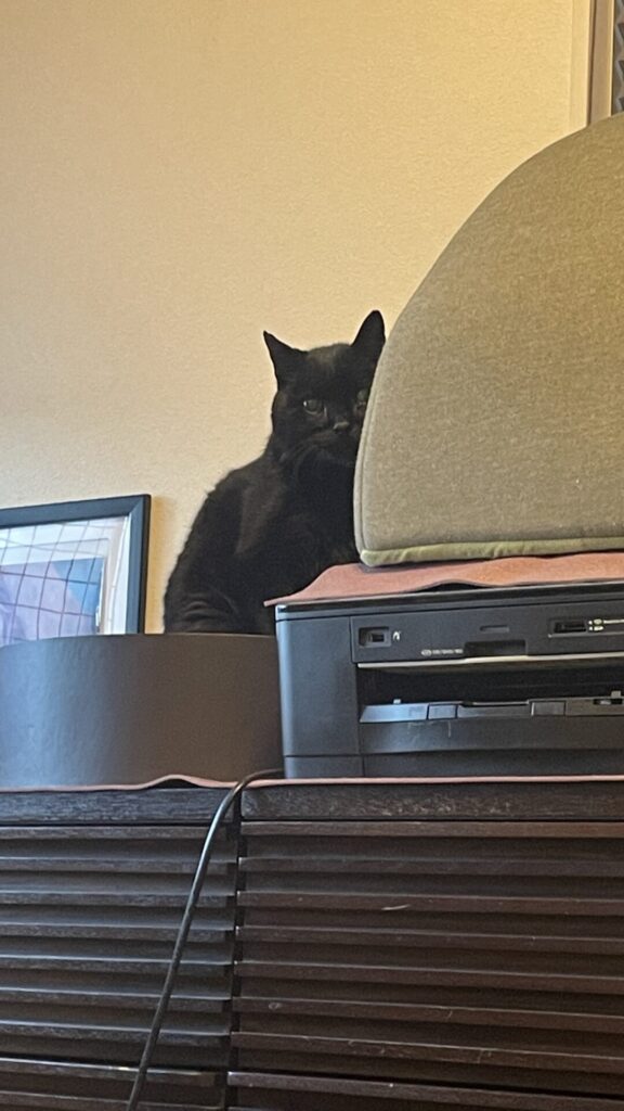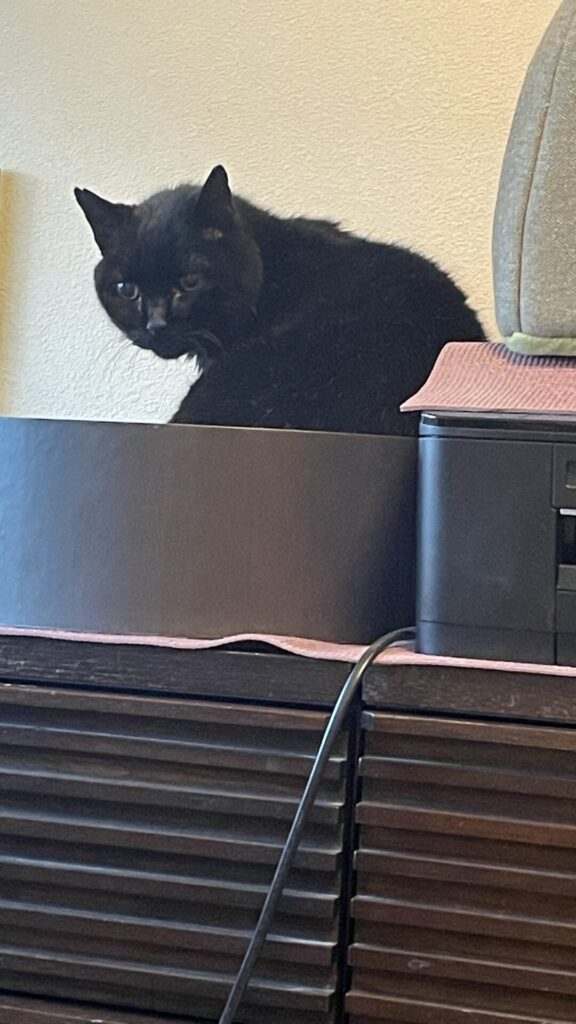 警戒心は、前よりも下がりましたが、やはり怖いのでタンスの上の寝床にかくれます😅