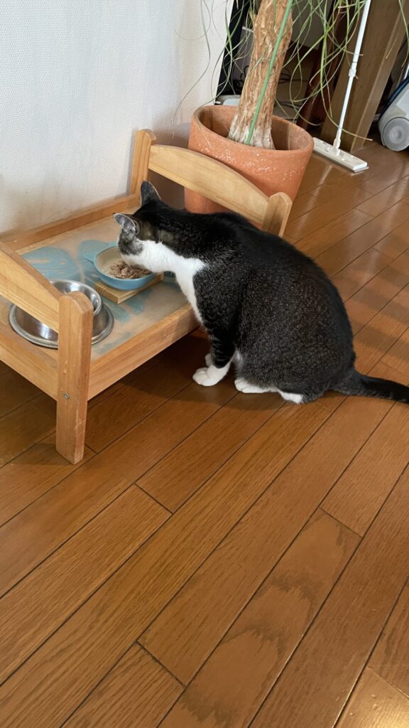 お部屋に入るとお布団の中でぐっすり寝ていたので、ご飯やトイレなどのお世話を先にしました。