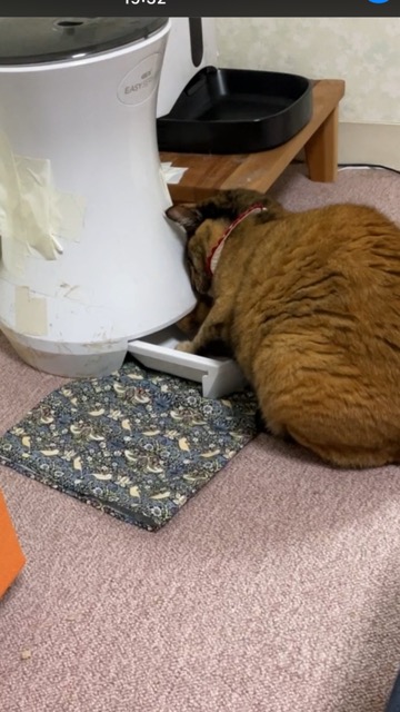 食いしん坊の、のこちゃん🐱。ジャラシはほどほどに、自動給餌器にお手手🐾を突っ込み、