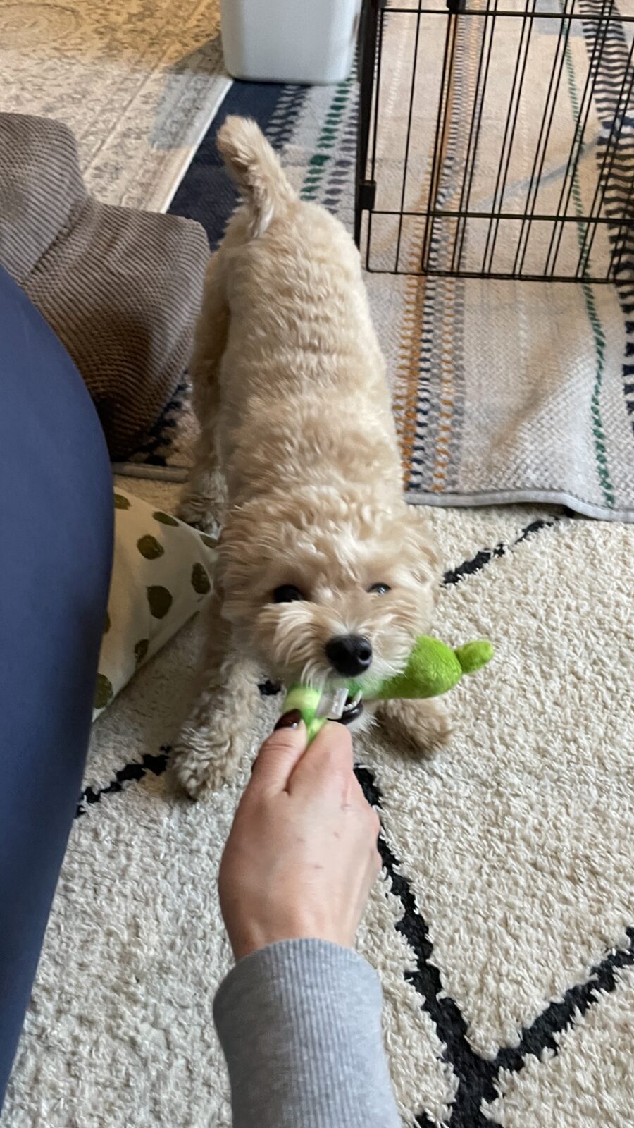 新しいカエルのおもちゃで、引っ張りっこなどをして遊びました。