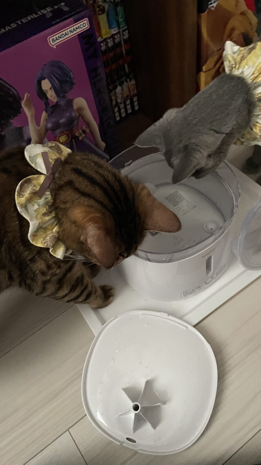 自動給水機の調子が悪くなってしまって調べていると、左右に座って覗き込んできました。