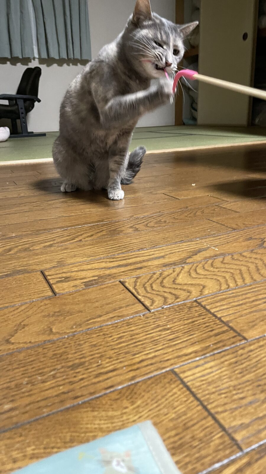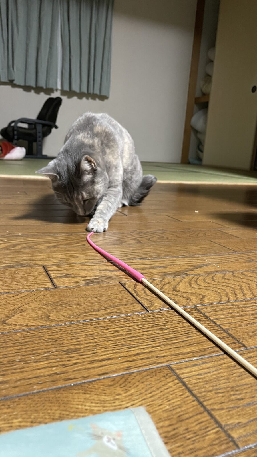 作業をしている時は距離をとって、ジーッと見ていましたがジャラシを出すと、お目目まん丸😁