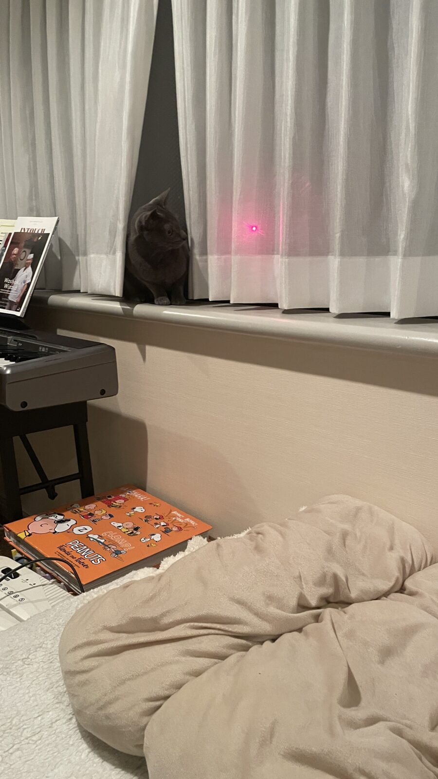 ローリーちゃんは、ずっとカーテンの後ろに隠れていました。