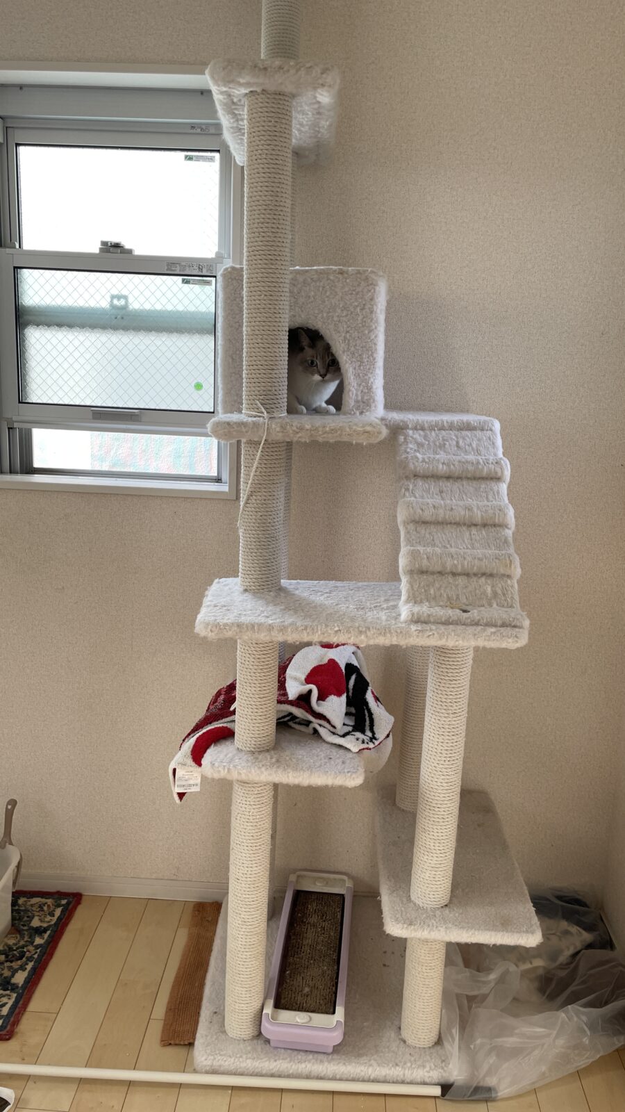 いつもは、ニャンズ達は隠れているのですが、さつきちゃんがキャットタワーにいました。