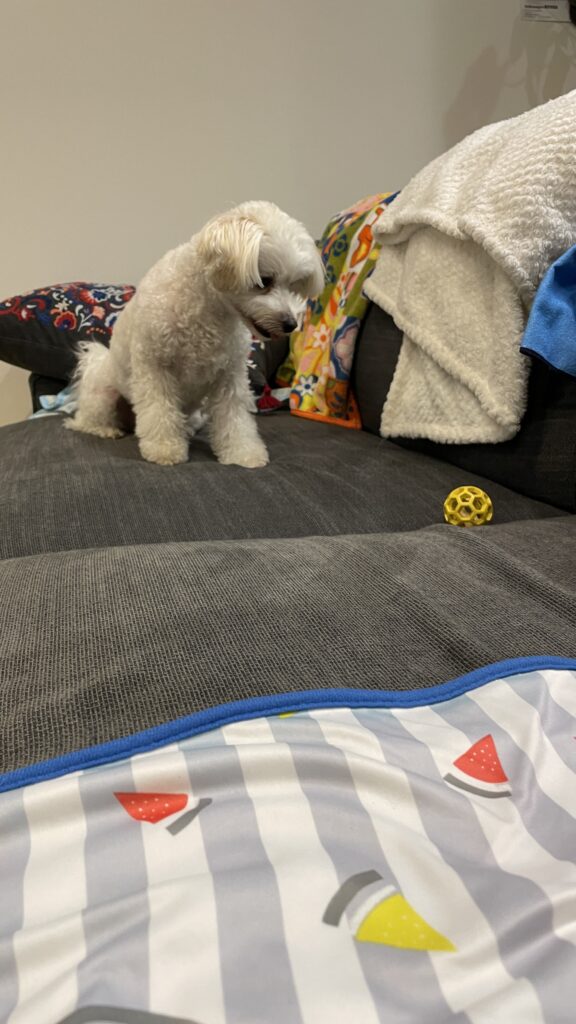 おやつボールを渡すと、咥えて床に叩きつけて中身を出そうとします。