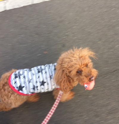 オモチャくわえてご機嫌にパトロールだよー😊