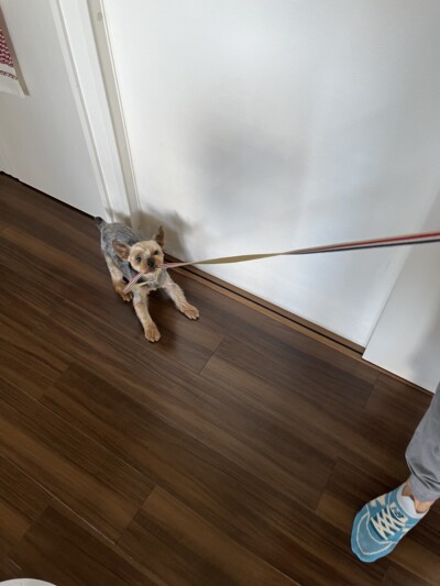 お散歩用リードを見せてもらってると リードをくわえてちょっと興奮してました💦