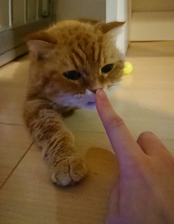 鼻も悪くなって来て飼い主様と間違えたかなー?でも、指挨拶してからナデナデしたから間違えてないよね??❤(ӦvӦ。)