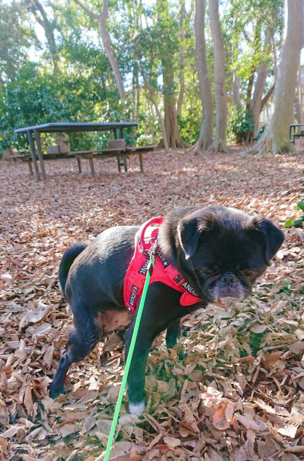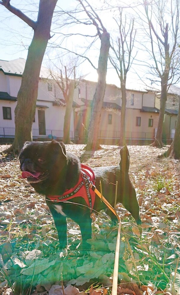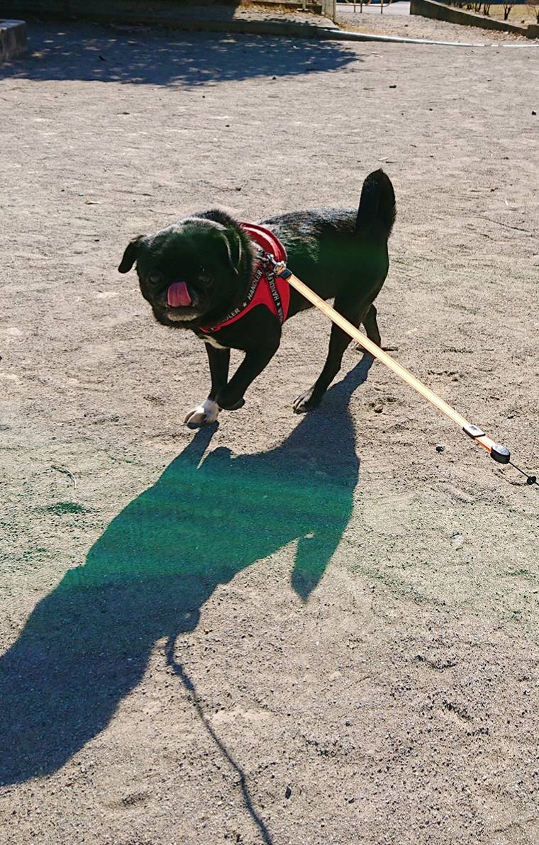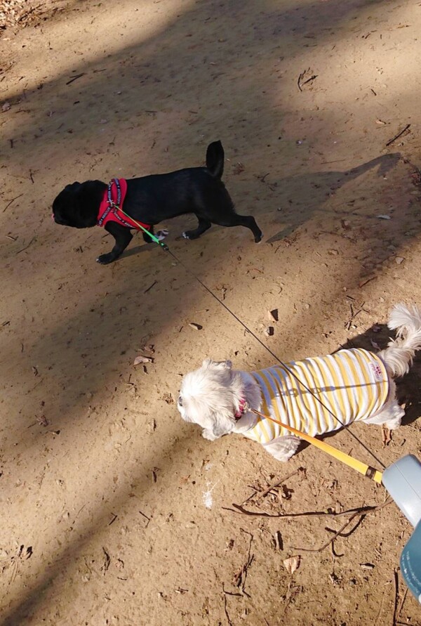 広場で伸縮リードを自由にすると、自由に歩くハナちゃんと、それでもシッターの側から離れないふぅちゃんと、性格は正反対です(笑)