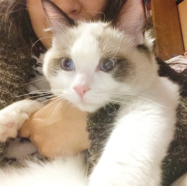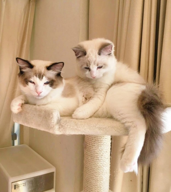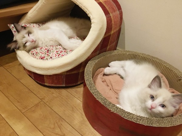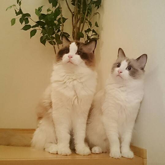 犬猫たくさんの大家族の一員になった「しらたまちゃん」❤先住猫の歳の近いラグドールの男の子にベッタリみたいで(*´艸`*)仲良しですね✨(写真右側)