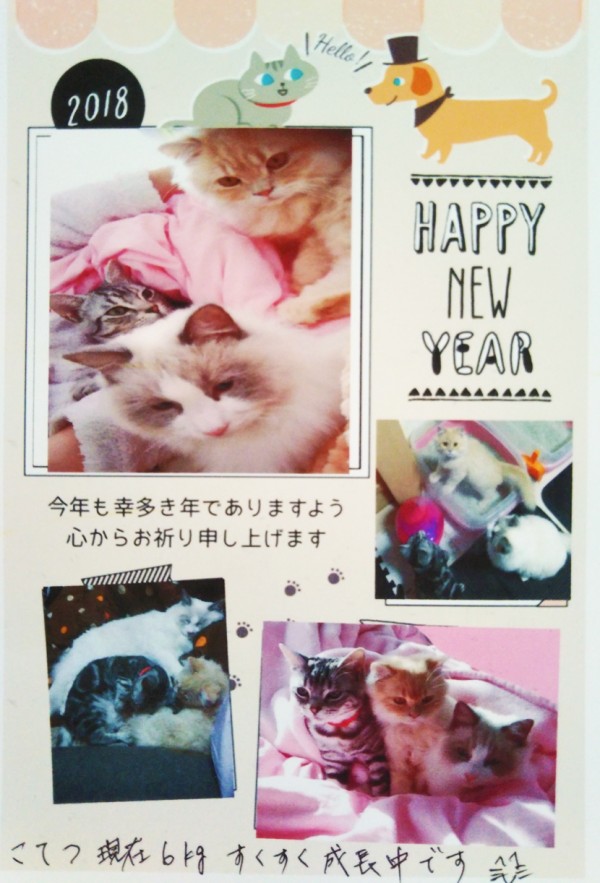 年賀ハガキを下さり有難うございます✨「こてつ君」、先住猫ちゃん達と楽しく過ごしてるみたいですね❤賑やかで良いですねぇ(*´ω`*)❤ラグドールはメスはあまり大きくなりませんがオスは大きくなります☆もう6キロ!凄いですね!