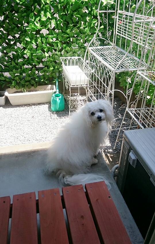 関節炎みたいなので、あまり長いお散歩へは行けないのですが、気晴らしの短時間のお散歩1日3回と、あとはお庭で1匹遊び❤