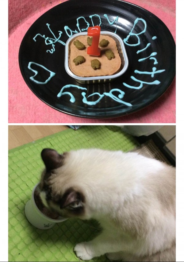 「ペットショップのケーキはイマイチだったので、ロイヤルカナンのご飯をグリーニーズのカリカリで飾って手作りケーキにしました。(笑)」