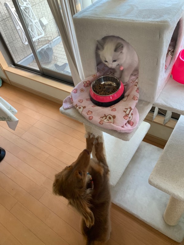 先住犬にダックスフントがいるみたいですが、帰り道にすぐに立派なキャットタワーを購入して組み立てて下さったみたいで、その上でダックスちゃんに見守られながらご飯をモクモクと食べている写真が(*´艸`*)笑