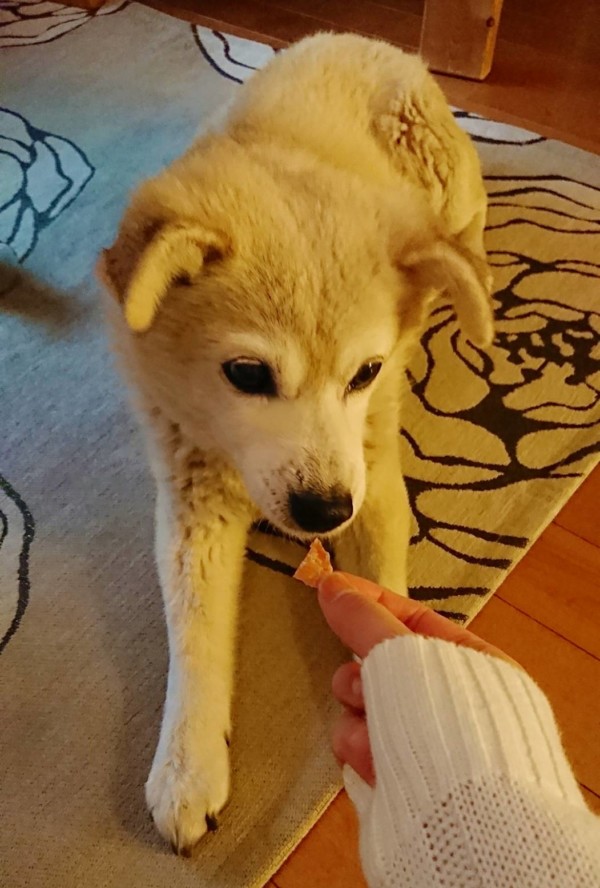 触って起こすとビックリしちゃいそうなので、鼻にオヤツを近付けて待ってみました(笑)