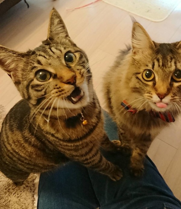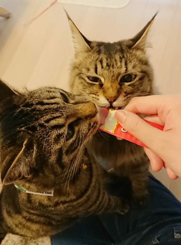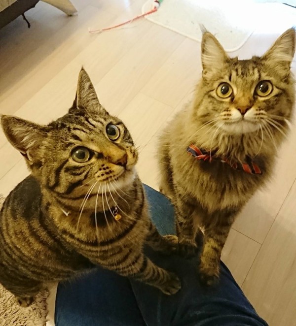 2匹揃ってシッターの膝に手を乗せてきて、とっても可愛いですね❤(ӦvӦ。)