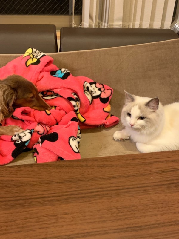 他のワンコやニャンコとも物怖じせずに一緒に過ごせているようです❤