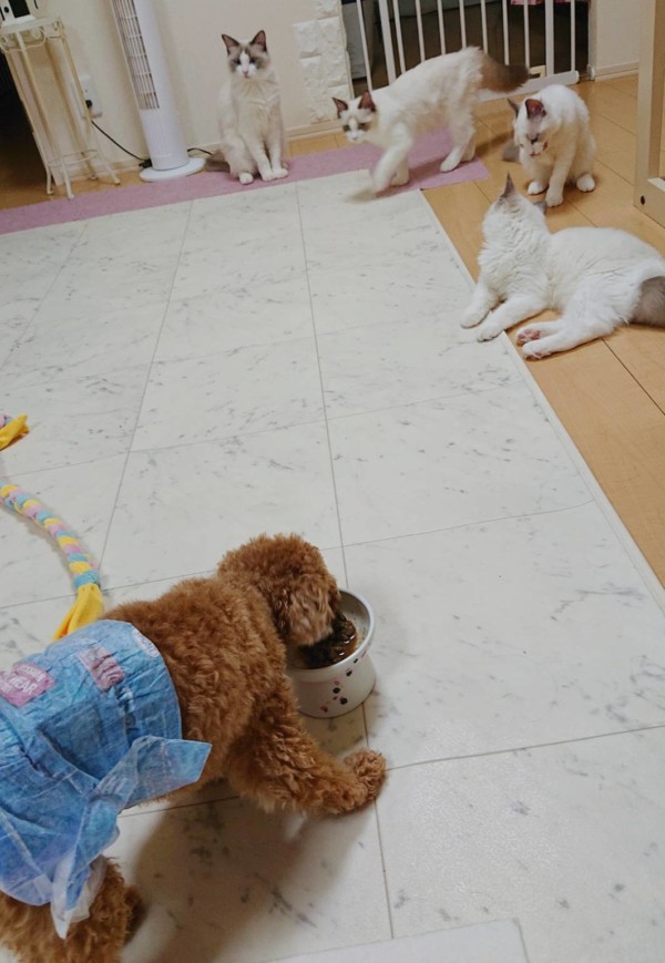 「落ち着いてご飯食べられないワン。しかも何だか増えてるんだワン。」