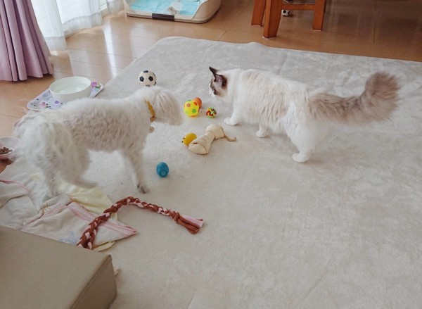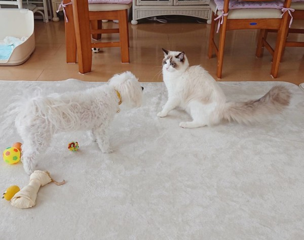 最初は猫を見ると吠えて追い立てていたペルちゃん、その度に猫達も2階へ逃げてましたが、どうやら吠えられるだけで攻撃をして来ないと悟ったようです(*´艸`*)