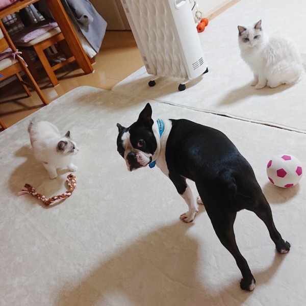 元々、吠えない子なので、猫達も少しずつふぅ太君が好きになってるみたい(*´∀`*)良かったね❤