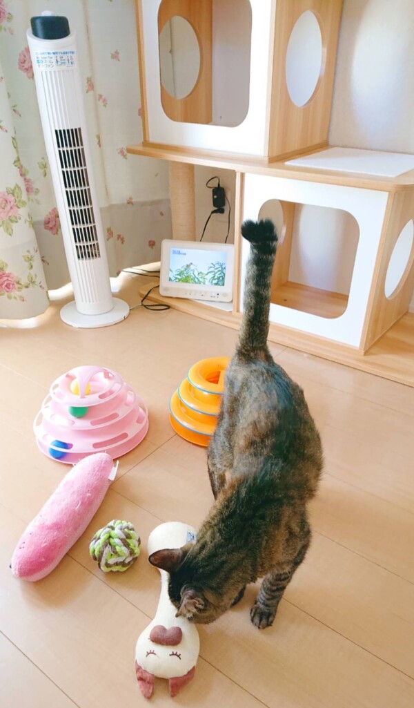 たくさんのオモチャに鳥の映像がエンドレスに流れるDVD、ごめんね、これで淋しさ紛らわせられる??(´・ω・`)💦