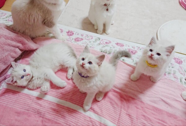 ○当キャッテリーの子猫は産まれてから色々な動物に囲まれて育っていますので1匹になった事がありません。