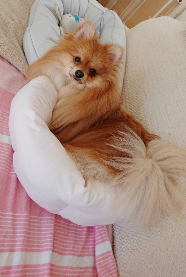 猫用の小さい丸ベッドにギュウギュウに詰まるのがお気に入りポジションになりました❤(ӦvӦ。)
