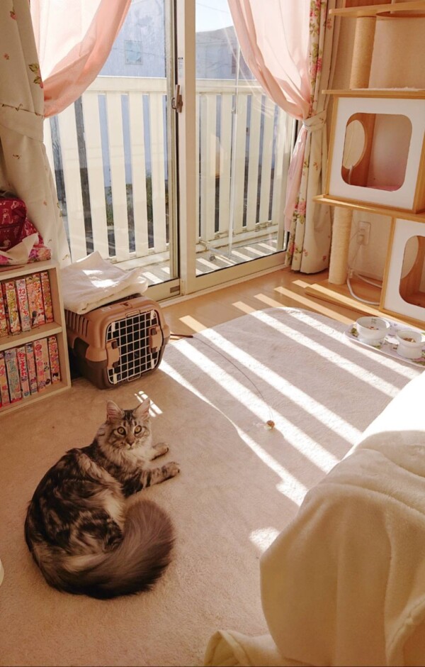 お部屋に慣れるまではカーテン裾に隠れていて(冷気が当たり)震えていたので実は寒がりさんかも(。ŏ﹏ŏ)ぬくぬく温度にしようね🍀