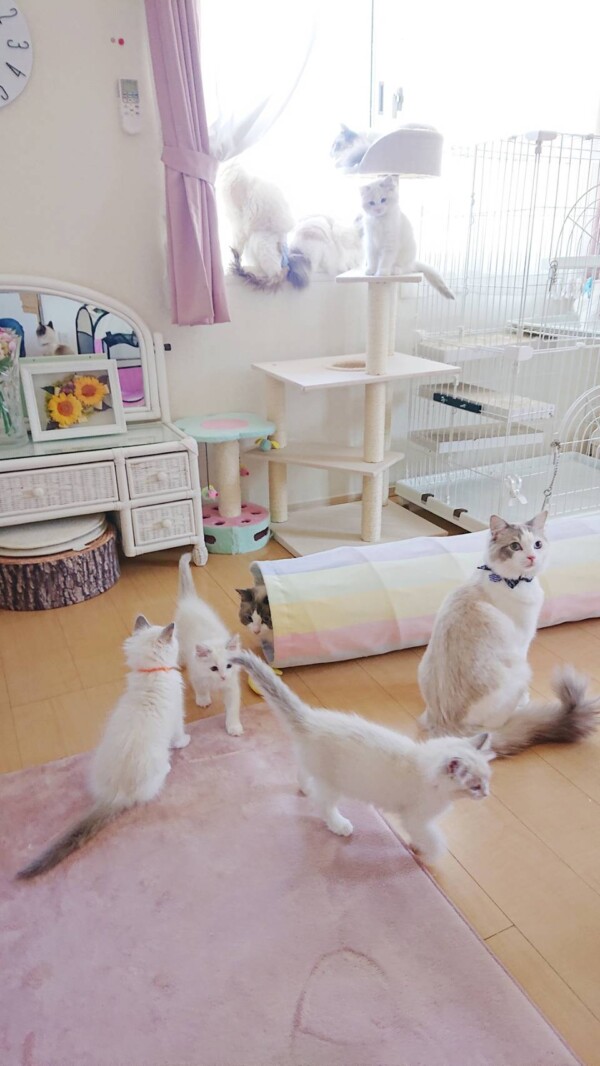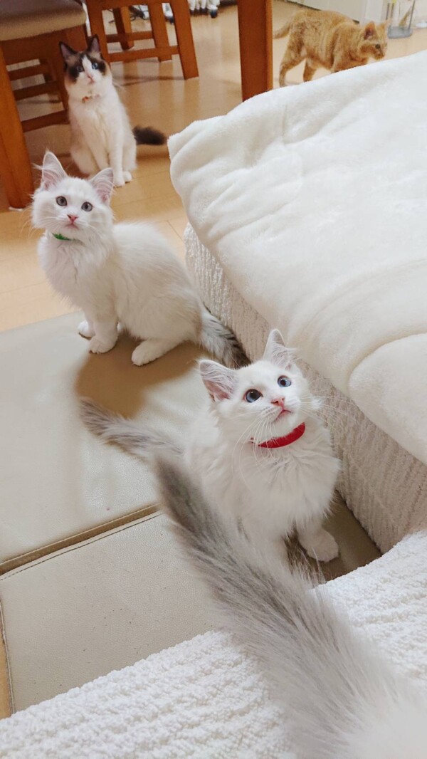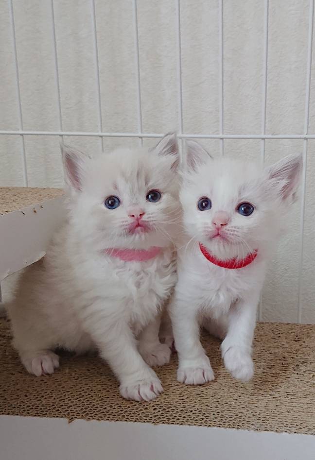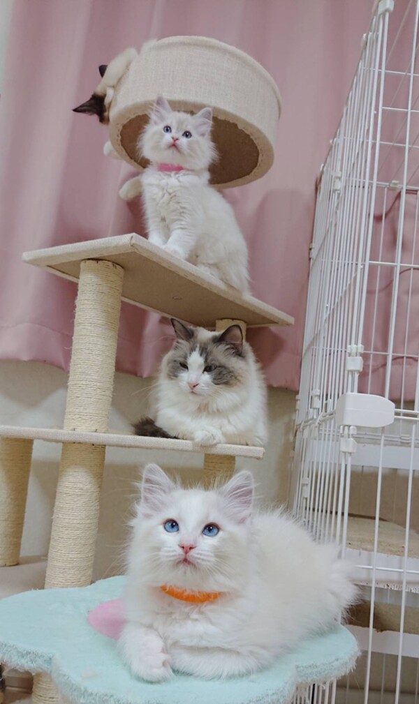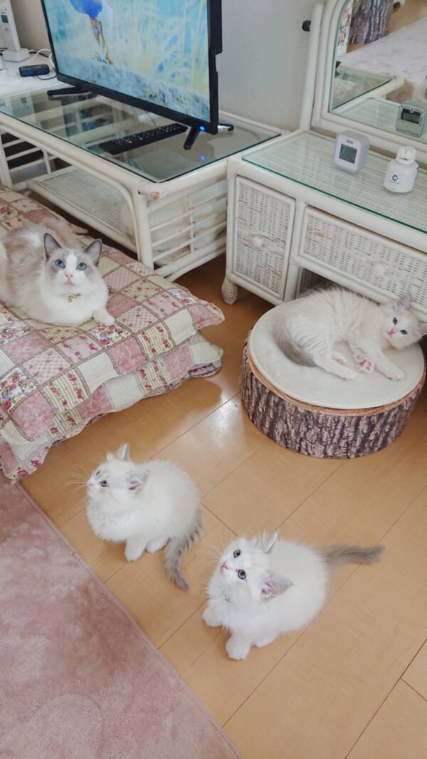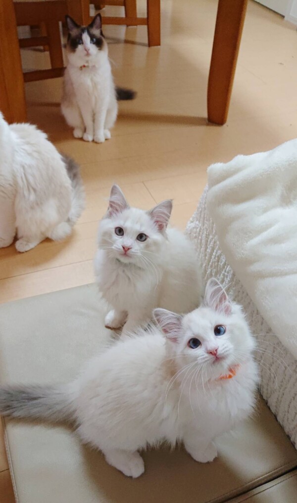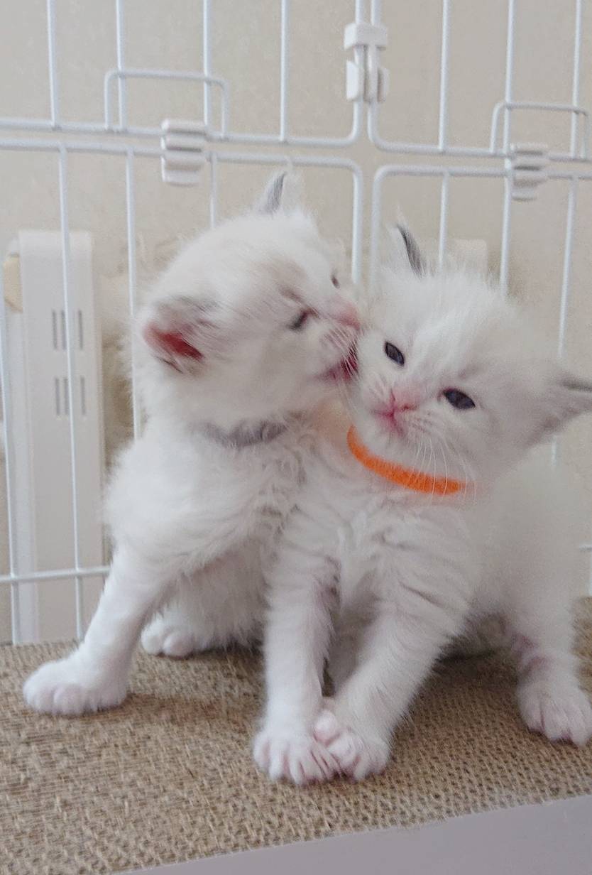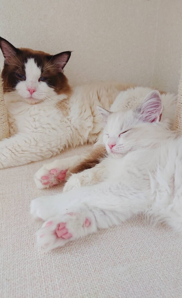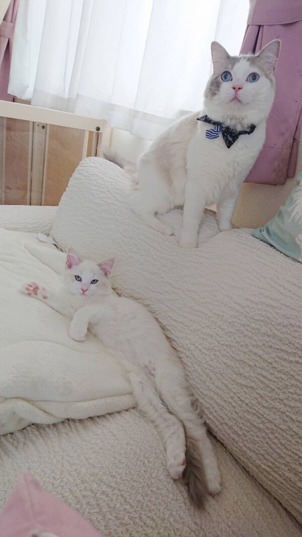 去年6月生まれライトブルー君ことレオ君のオーナー様が、レオ君に妹をと2匹目も当キャッテリーを選んで下さいました٩(♡ε♡ )۶名前は『レミちゃん』に❤レミちゃんはとても甘えん坊で可愛いのですが、うちの詩音や神桜のように分離不安症(1匹の時間が長いと不安から問題行動をおこす)の可能性があったので、御家族様がいつも誰かいるか、または(犬は好きではないので)先住猫がいるかの縛りがあったので、なかなかオーナー様が決まらず( ;∀;)ラグドール大好き旦那様と、今回もうちのお泊りワンコとラグドール達をまとめて遊んで下さる素晴らしき両刀動物使いの奥様(笑)とレオ君のいるお家で本当に良かったです🍀今後も異母兄妹2匹の絡みの御報告お待ちしております(*´艸`*)