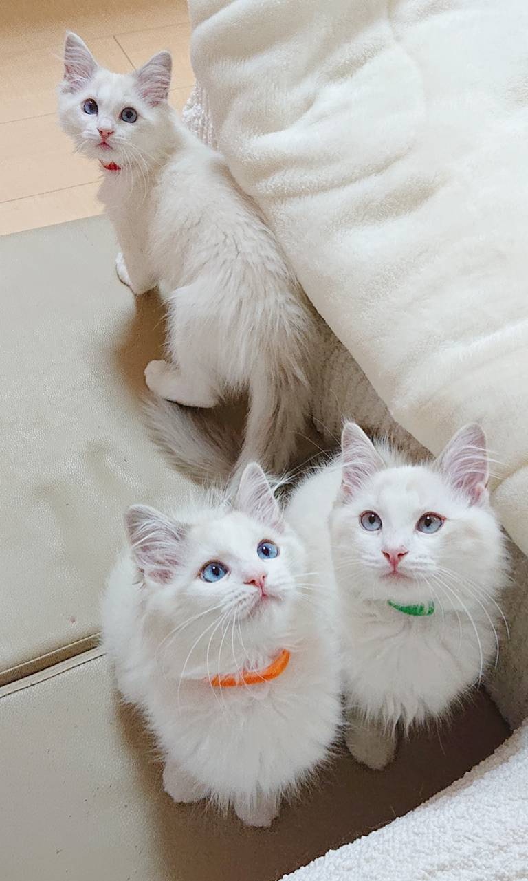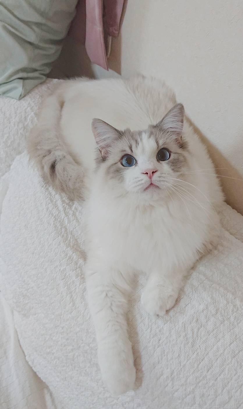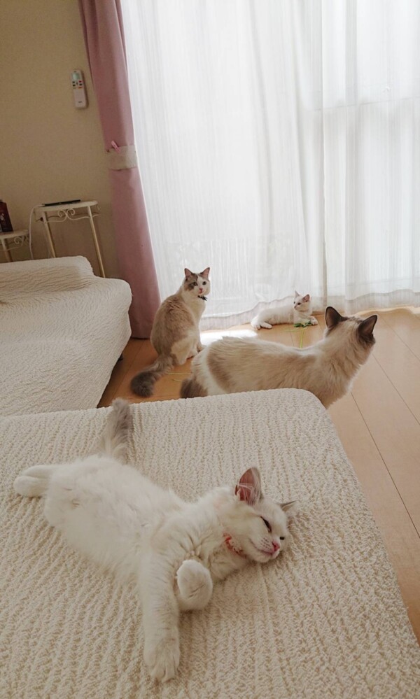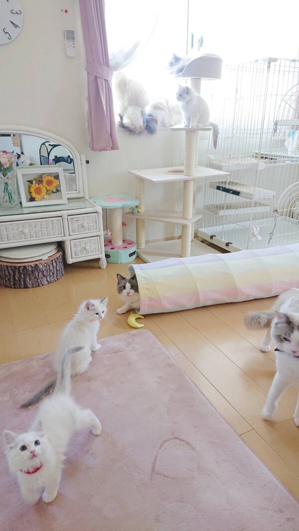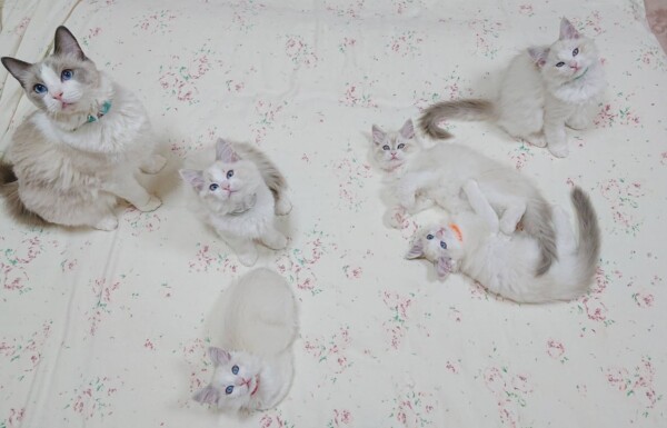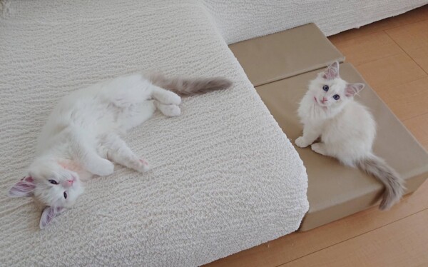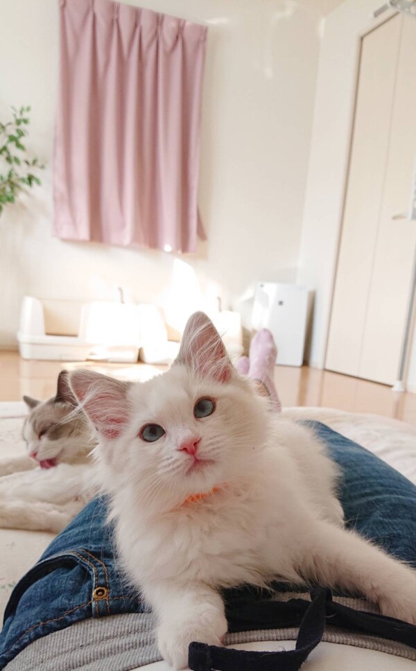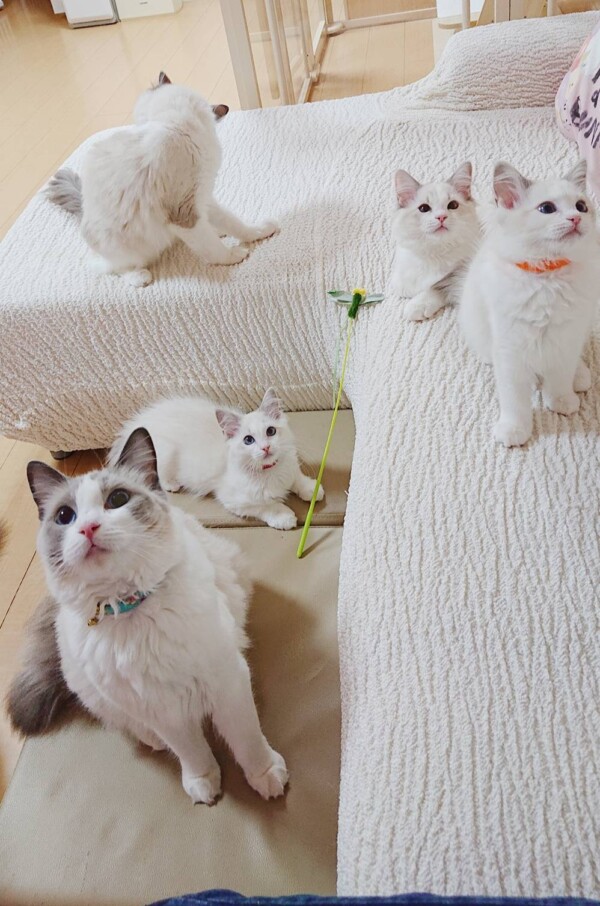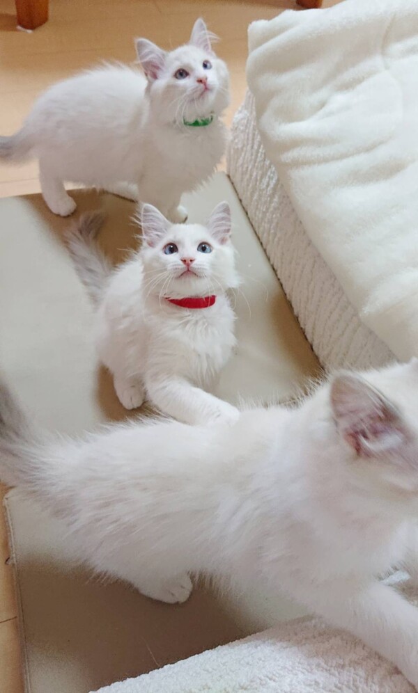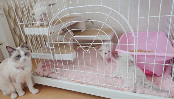 去年6月生まれライトブルー君ことレオ君のオーナー様が、レオ君に妹をと2匹目も当キャッテリーを選んで下さいました٩(♡ε♡ )۶名前は『レミちゃん』に❤レミちゃんはとても甘えん坊で可愛いのですが、うちの詩音や神桜のように分離不安症(1匹の時間が長いと不安から問題行動をおこす)の可能性があったので、御家族様がいつも誰かいるか、または(犬は好きではないので)先住猫がいるかの縛りがあったので、なかなかオーナー様が決まらず( ;∀;)ラグドール大好き旦那様と、今回もうちのお泊りワンコとラグドール達をまとめて遊んで下さる素晴らしき両刀動物使いの奥様(笑)とレオ君のいるお家で本当に良かったです🍀今後も異母兄妹2匹の絡みの御報告お待ちしております(*´艸`*)