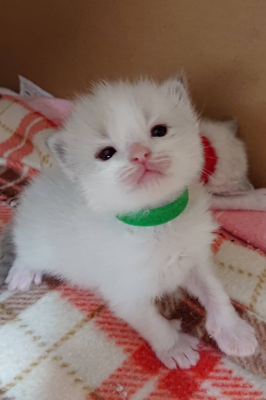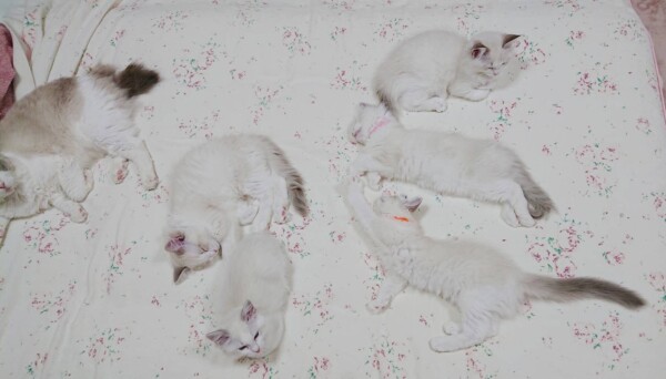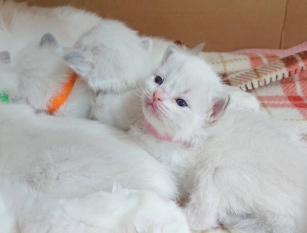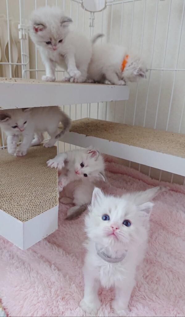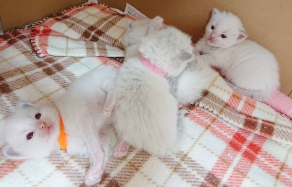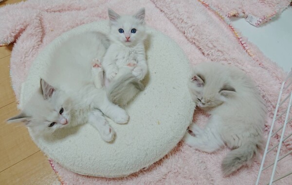 普通の猫ちゃんが生後10日〜2週間で目が開くのに、ラグドールの成長はゆっくりなので3週間でお目々が全員全開になりました🌼