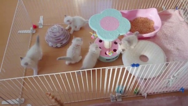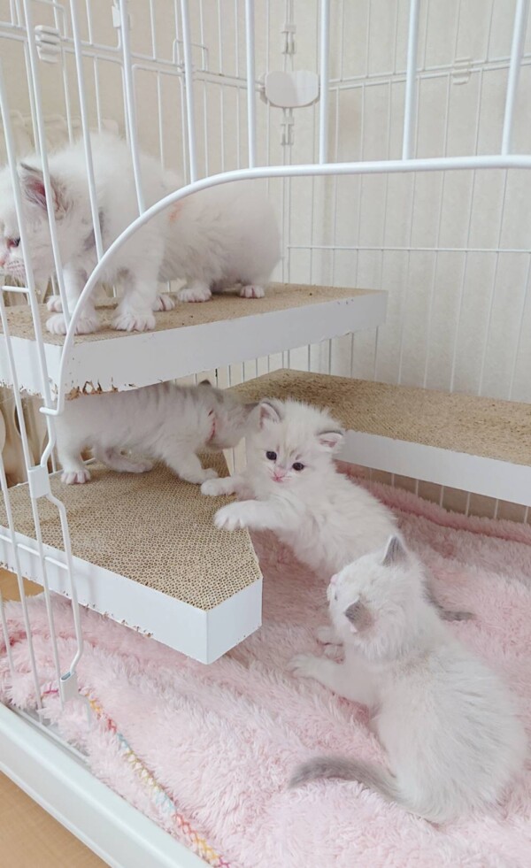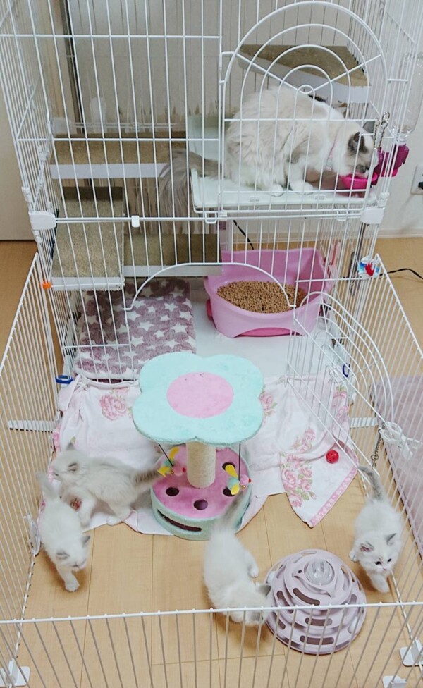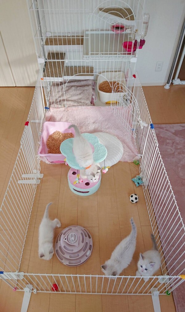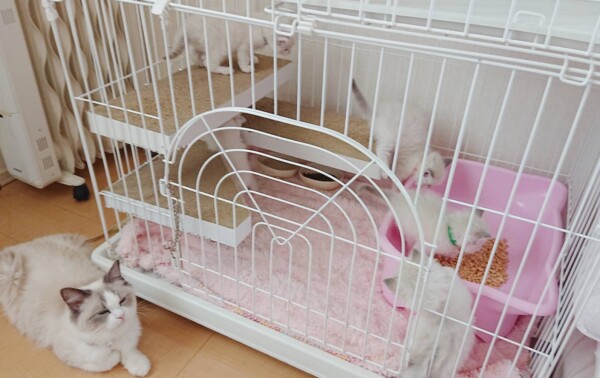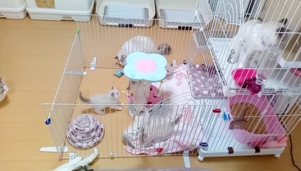 ○当キャッテリーの子猫は産まれてから色々な動物に囲まれて育っていますので1匹になった事がありません。