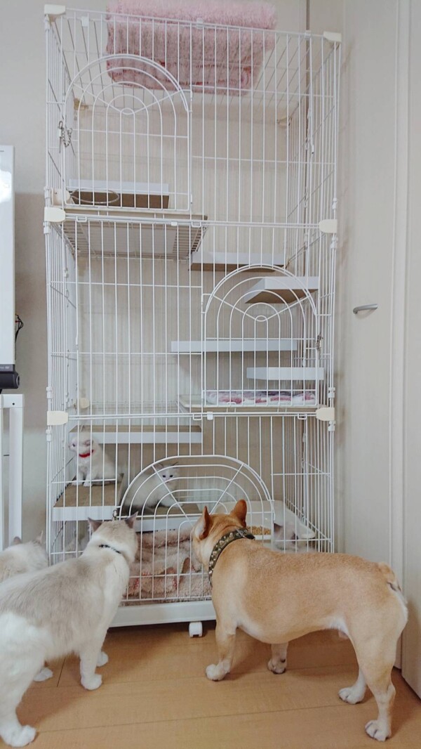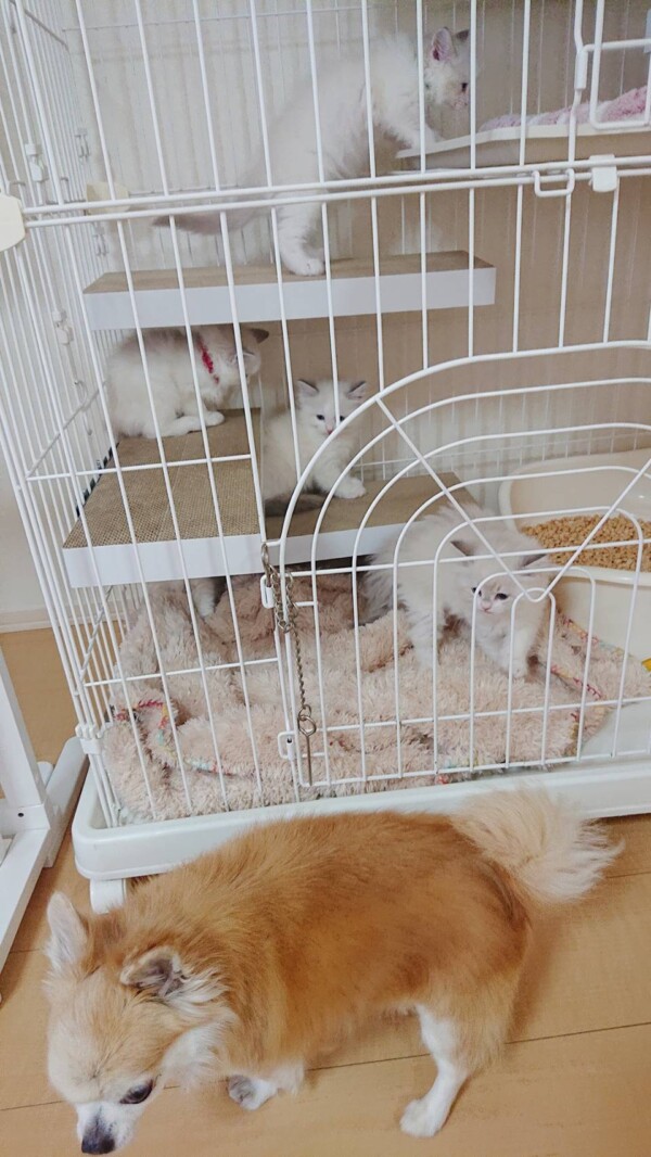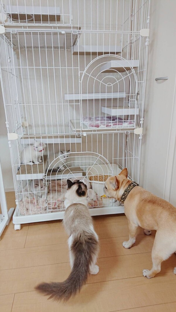 1階の3段ケージもカスタムして、ワンコ部屋で他の動物慣れトレーニングです🌸(協力者・ロック君&ジョナ君)